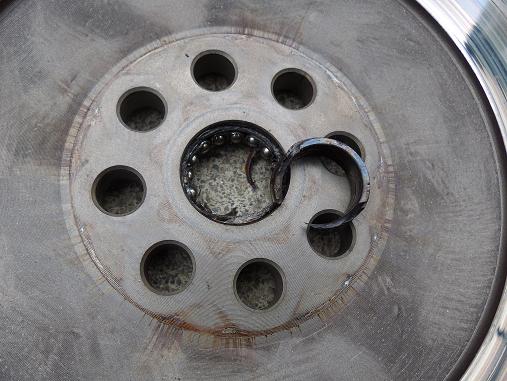 「クラッチペダルが引っ掛かる」という不具合のあったS2000・・・ネットで検索したのと症状が同じということで、ペダルとマスターシリンダーを繋ぐピン&ブッシュを交換したものの不具合再発。。。(涙) ミッション降ろしてクラッチの中身を確認してみると、レリーズベアリングガイド、レリーズベアリング、パイロットベアリングが破損してましたよ。 クラッチディスクやクラッチカバーの本体も点検しましたが、目視できる範囲では問題なさそうです。 しかし・・・何が原因でこうなったのかハッキリしませんよ。 オーナーさんと相談した結果、周辺パーツを全交換することになりました。
