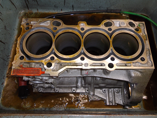 シリンダーブロックを洗浄中!! 灯油で大まかな汚れを落としていきますよ。 外では雷が鳴り始めました。 少しは涼しくなるかな?(笑)