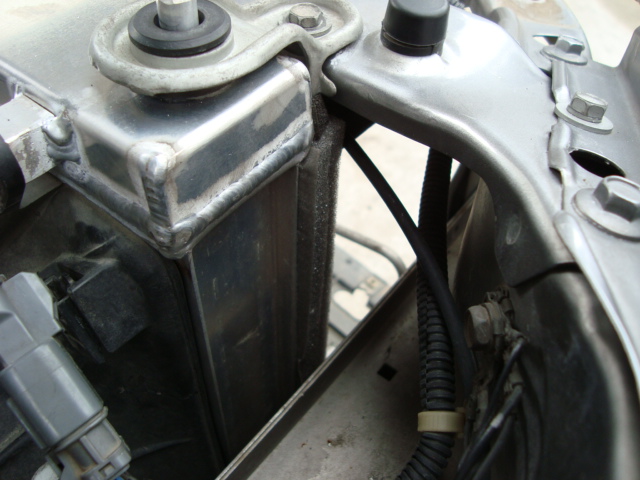 こんな感じでラジエターの横から滑り込ませます。 ラジエターのアッパーマウントを外すと、作業が楽に行えますよ。