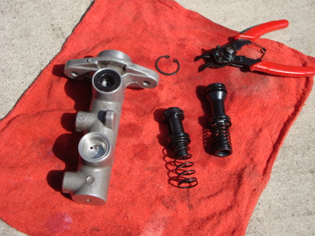 基本的にアッセンブリー交換をお勧めしているのですが・・・理由を知りたい人はArrowsに遊びに来てね!(笑)・・・ご希望によりオーバーホールとなりましたよ。 ってことで、マスターシリンダーを外して中に入っているピストンを取り出し、新しいものと付け替えますよ。