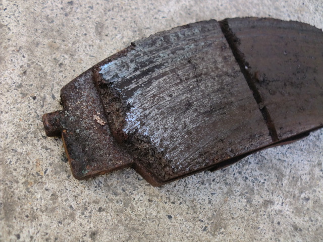ブレーキローター、キャリパー、パッドをチェック!! 写真では判り難いですが、ローターに細かいヘアークラックが入っています。 キャリパーのダストブーツの一部に穴が・・・。 パッドはご覧の通り。。。