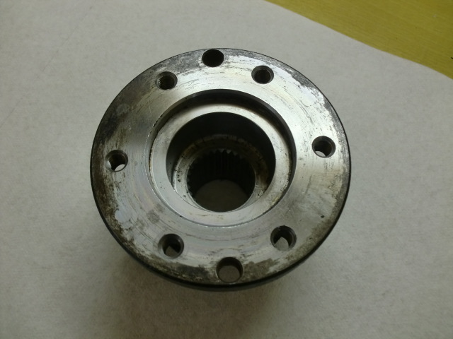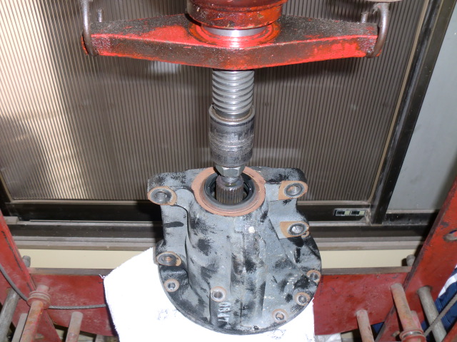 そして・・・最後にデフキャリアとコンパニオンフランジをAP1からAP2のものに交換して全ての作業が終了するというところで問題発生!!(汗) AP1のデフキャリアからピニオンギアが抜けません。 通常、プラハンで叩けば外れるのですが・・・油圧プレスで450kgf/㎝2まで圧力を掛けてもダメ。(サスペンションブッシュなんかは200㎏/㎝2程度で抜けますよ。) これ以上圧力を掛けるとピニオンギアのネジ山がダメになりそうだし、ケースも歪みそうなので作業を断念。。。(涙) とりあえず、オーナーさんに連絡をしてどうするかを検討することにしました。