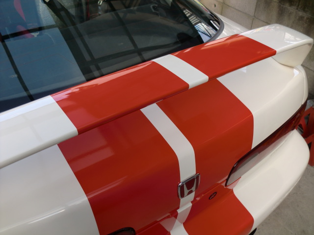 まずは、先日お引渡ししたGod-R号から。 「来年のGTCCに参戦するので、クルマをカッコ良くしたい!!」ということで、真っ赤なレーシングストライプを入れてみました。 一般的なバイナルグラフィックもカッコ良かったのですが、最近のヨーロッパ車で流行っているのとクラブマンレーサーっぽい感じを出したかったので、レーシングストライプにしてみましたよ。