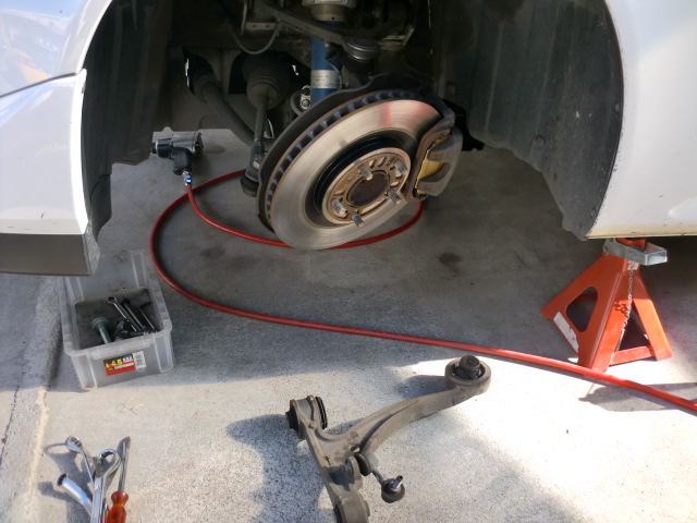 マッハ号はフロントのコンプライアンスブッシュの交換です。 コンプライアンスブッシュを交換するためフロントのロアアームを外すとアライメントが狂ってしまうため、アライメントの再調整が必要となりますよ。