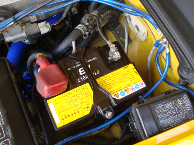 装着したバッテリーは、R34GT-R純正バッテリーです。 ドライバッテリーほどではありませんが6.4㎏と軽量で、エアコン&オーディオの使用にも十分耐えてくれますよ。 S2000で軽量化を考えている方にはお勧めのバッテリーです。