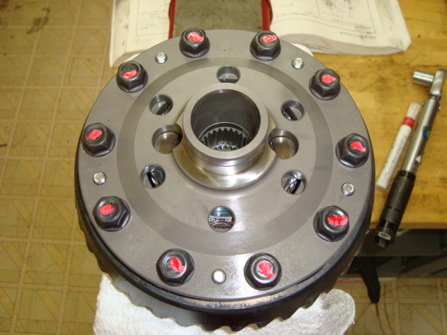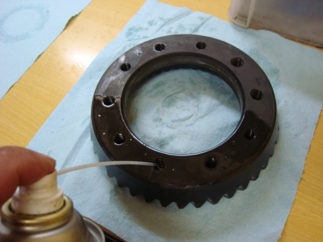 リセッティングしたLSDをリングギアに取り付ける準備をします。 リングギアボルトが入る穴を脱脂して、リングギアボルトにロックタイトを塗布します。 ここの部分を確りやらないと、ボルトが緩んで飛び出しでブローしてしまいます。