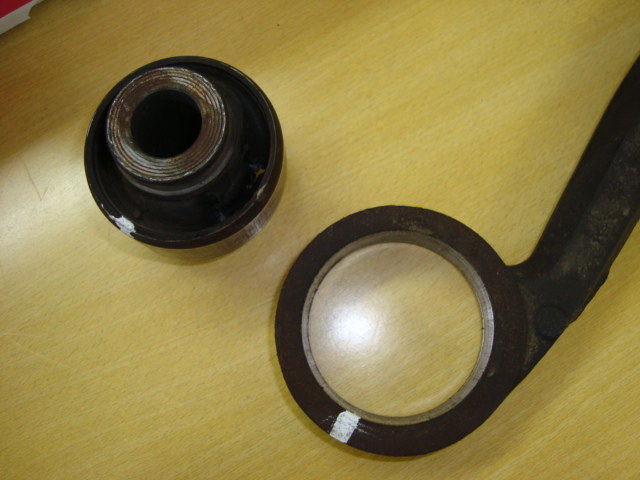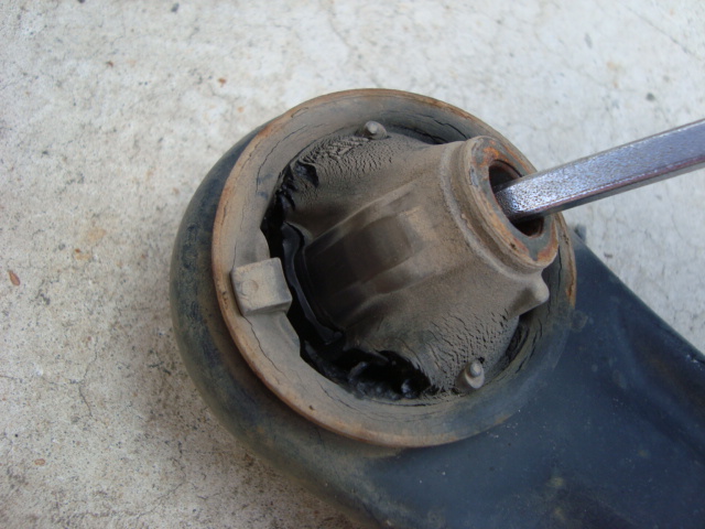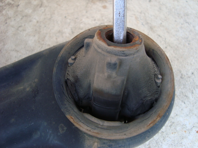 フロントのショックを取り付ける前に、ロアアームのコンプライアンスブッシュを交換です。 ご覧の通り、見事に切れてました。。。(苦笑)