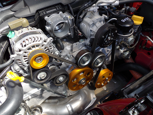 オイルフィラーキャップやオイルレベルゲージ等が黄色のためか、ゴールド色でアルマイト処理したプーリーが86のエンジンルームに違和感なくマッチしていると思うのですが・・・如何でしょうか? 派手な色なのに嫌味なく収まるので、さりげなく装着しているのを主張したいお客様にはピッタリだと思いますよ♪ エンジンレスポンスアップはもちろん、ドレスアップパーツとしても最高の商品です♪ ご注文は、Arrows(Mail:ar-ask@arrows-japan.com TEL:042-379-6911)まで!!