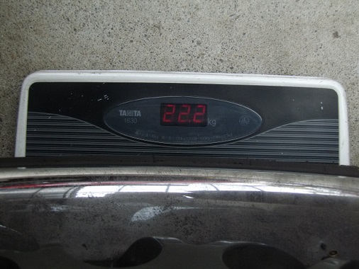 おぉ、軽!!(驚) 上の組み合わせに比べて1本当たり2.4㎏軽いZe!! 4本で9.6㎏。 新品タイヤ同士なら10㎏は違うか!? 回転部分だけに、これは効きそうだZo!! こいつは今から楽しみだ!!