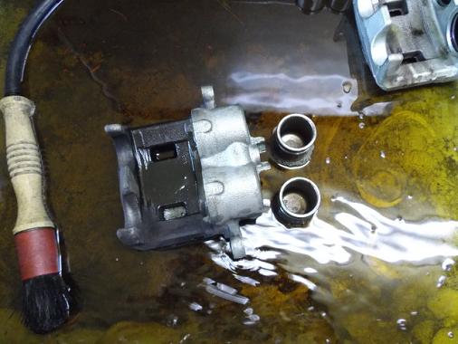 破けたダストブーツの穴から入ってきたパッドの粉がピストンに固着して落ちません。。。 雨水による錆びが発生していなかったのはラッキーでした♪