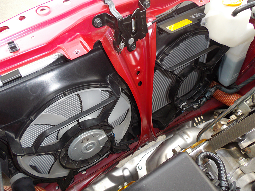 コンデンサーTYPE-Cによってラジエターの右前がむき出しになり、走行風を直接受けることが出来るようになった訳ですが・・・高速走行時にラジエターを通過する走行風の抵抗を減らすため、裏側にあるファンを撤去してみました。 ちなみに、ファンの撤去で約1kgの軽量化になりますよ♪