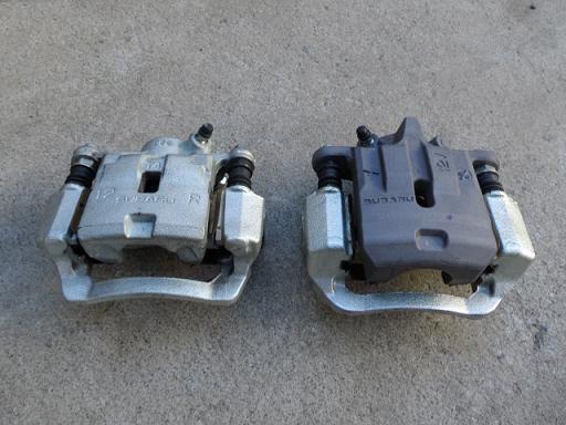 フロントとは異なりリアキャリパーは本体ごと交換になります。(フロントの場合、ローター径が大きくなるものの厚みが変わらないので、キャリパーサポートのみの交換でOKです。) で、このリアキャリパー・・・何と、本体がアルミ製なんです!! どおりで色が違うと思いました。 計量はしませんでしたが、明らかに軽かったですよ♪ Gグレードからすれば、これは立派なチューニングパーツですね!!
