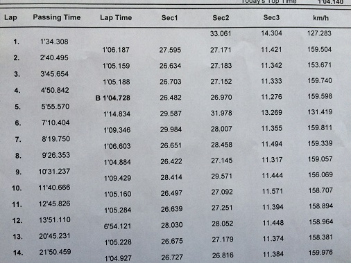 その後、265/35R18を履いて走ってみると 1分4秒728が出ました♪ RE-71Rベストが 1分4秒513なので、まあまあかな? 結局、17周も走ったわけですが・・・散々走って分かったのは真冬とはタイムの出方が違うということ。 何がどう違うかはナイショということでで。(笑)